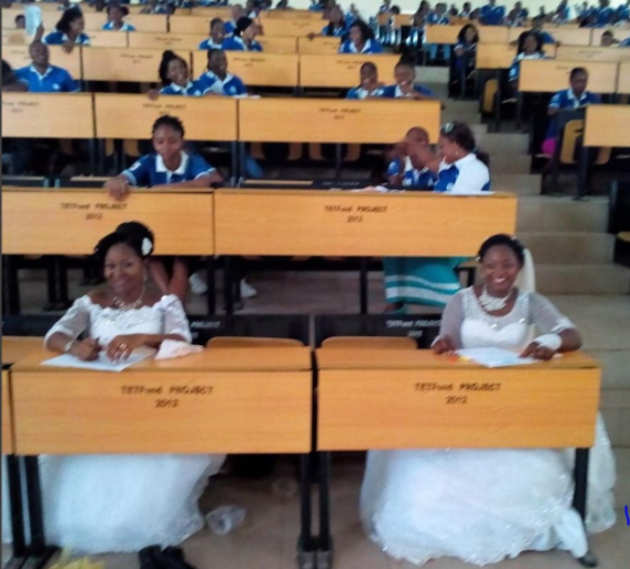 viral photos of two final-year Mass Communication students of the Benue State University writing their exam in their wedding gowns has been trending online and we admit it is really worth it.