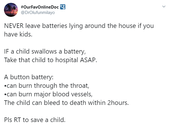 A Nigerian doctor @DrOlufunmilayo on Twitter has shared tips and measures to take if your child accidentally swallows a battery.