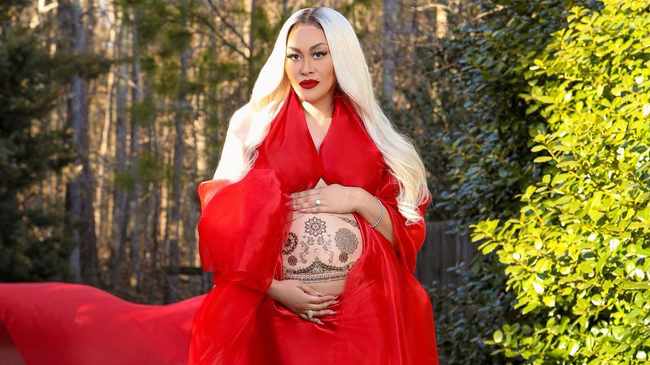 She also posted another picture of herself wearing a red gown by Andrae Crenshaw, showing off the henna on her big belly.