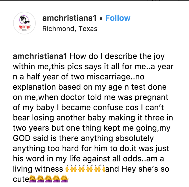 The woman who goes by the Instagram handle, amchristiana1 posted new photos of her baby and shared the amazing news on Instagram.