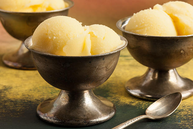 - Pour mixture into the freezer can of an ice-cream freezer; freeze according to manufacturer’s instructions. Spoon sorbet into a freezer-safe container. Cover and freeze 1 hour or until firm. Garnish with mint sprigs, if desired.