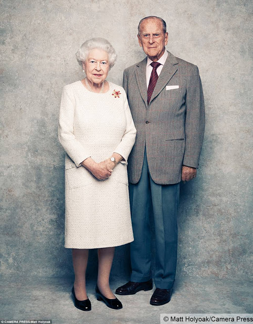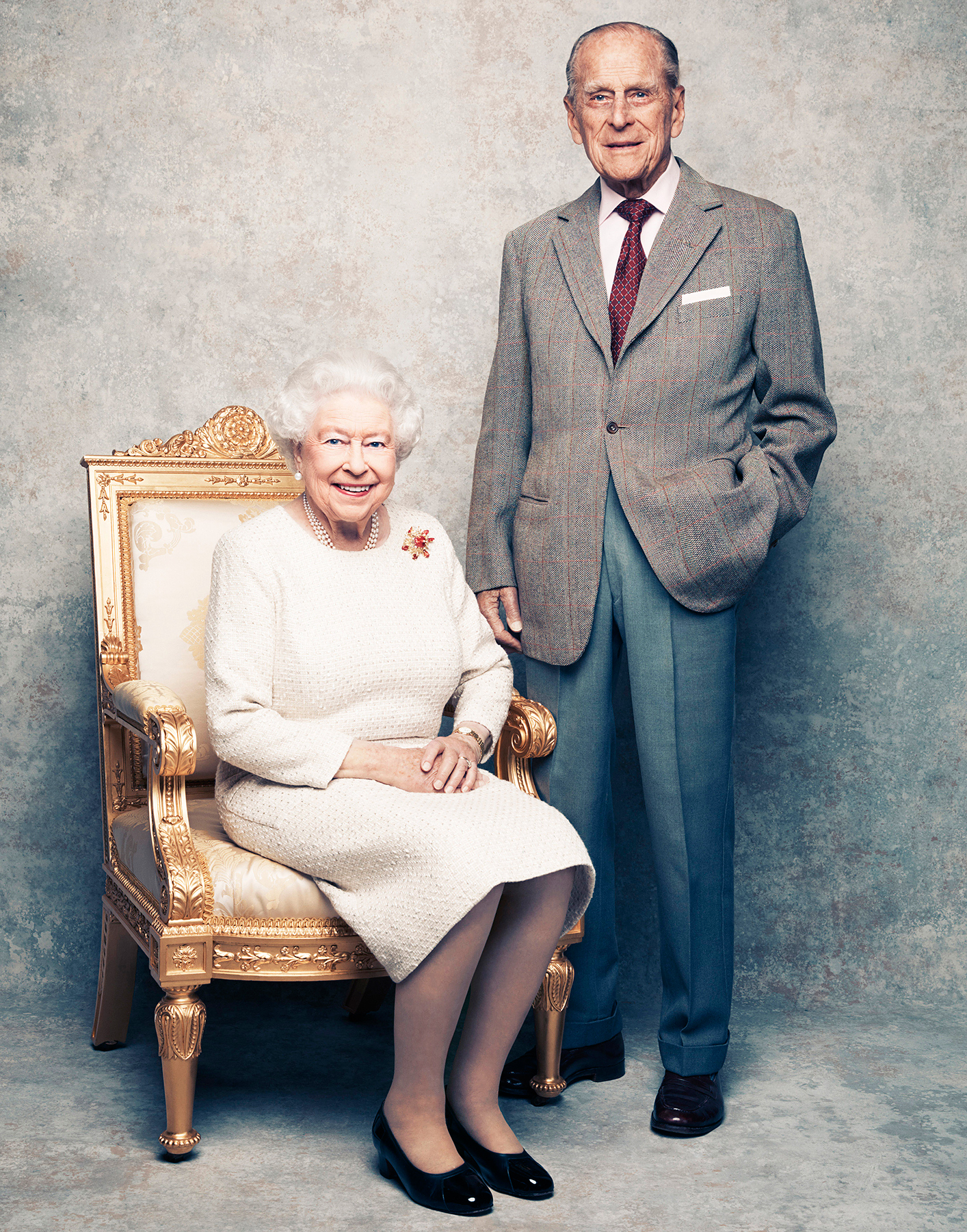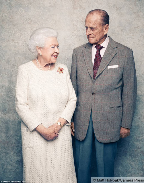 Taken by British portrait photographer Matt Holyoak, the images show the couple in the White Drawing Room at Windsor Castle. The Queen, 91, wears a yellow gold broach that Philip, 96, gave her decades ago in 1966, according to People.
