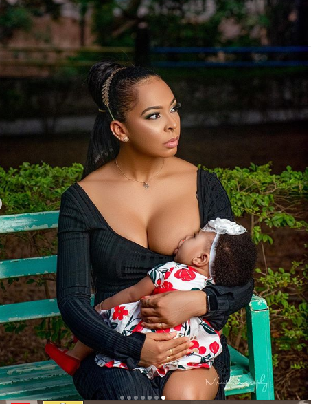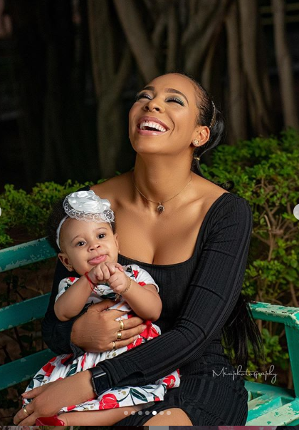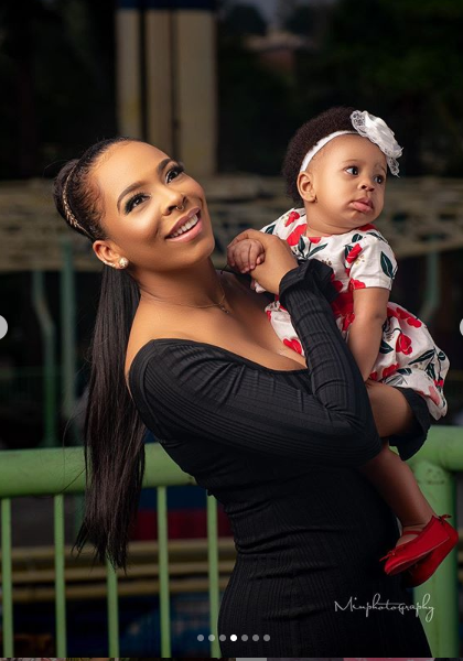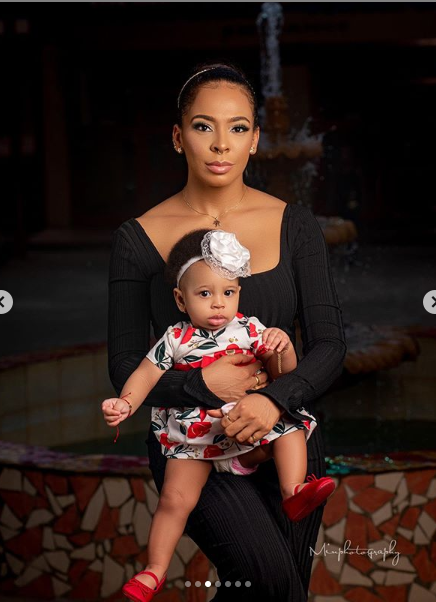 To mark her first birthday as a mother, the exBBNaija star shared new photos of herself and her daughter with the caption: